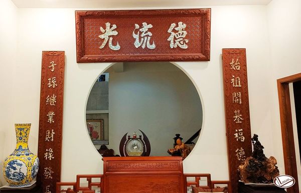 Bức hoành phi ĐỨC LƯU QUANG được chạm khắc tỉ mỉ tăng thêm sự trang nghiêm và tôn kính cho không gian thờ tự