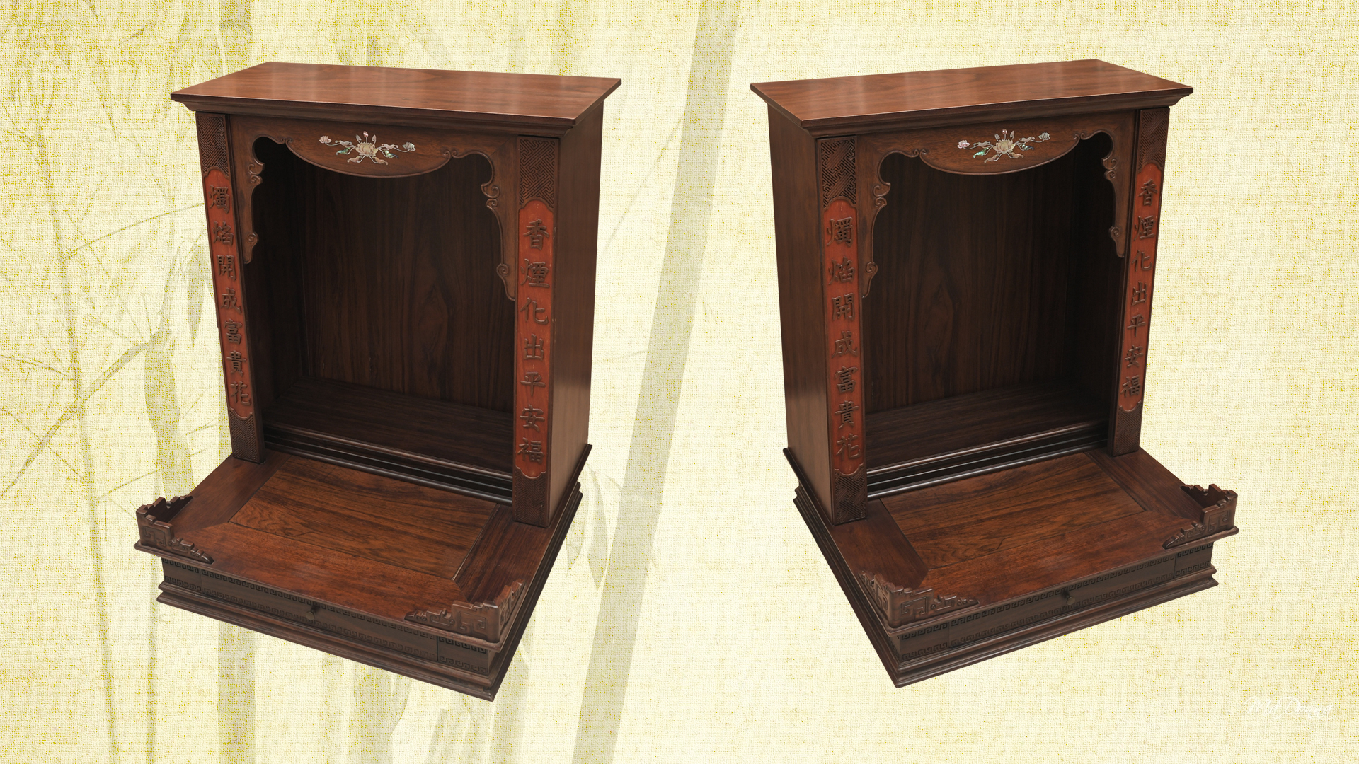 - Chất liệu gỗ quý, màu sắc trầm ấm, kỹ thuật sản xuất tinh tế, các đường gỗ mượt mà trơn mịn. Hai bên thành bàn thờ được khắc thêm câu đối, bên trên cẩn hoa văn tỉ mỉ.