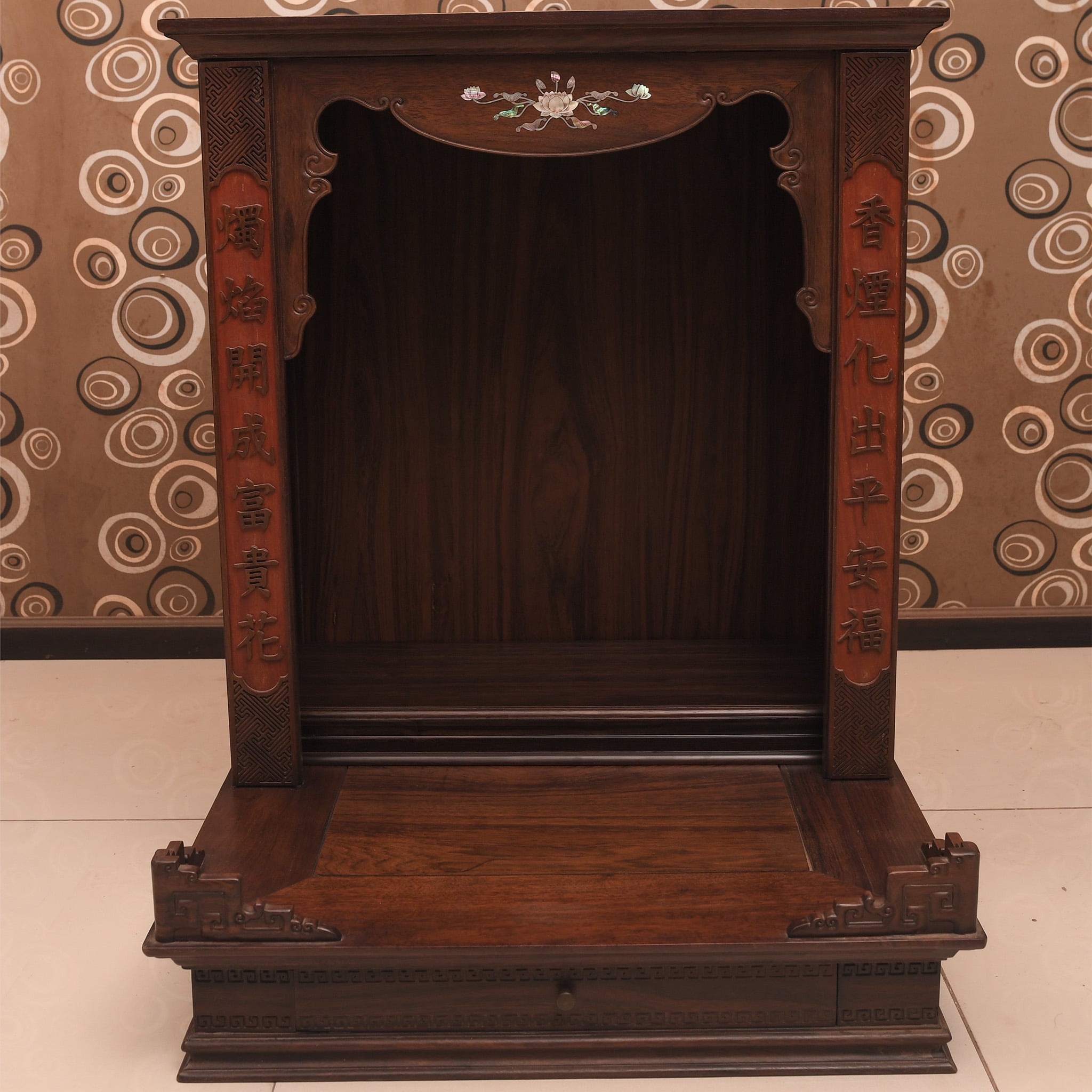 - Bàn thờ thần tài, thổ địa trung có kích thước vừa phải, phần đế có khay kéo giúp để được nhiều vật dụng phong thủy cho gia chủ hoặc chủ cửa hàng, doanh nghiệp.