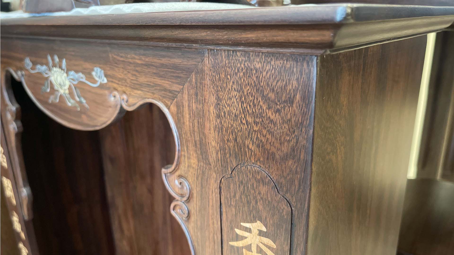 - Chất liệu gỗ quý, màu sắc trầm ấm, kỹ thuật sản xuất tinh tế, các đường gỗ mượt mà trơn mịn, cẩn hoa văn tỉ mỉ.