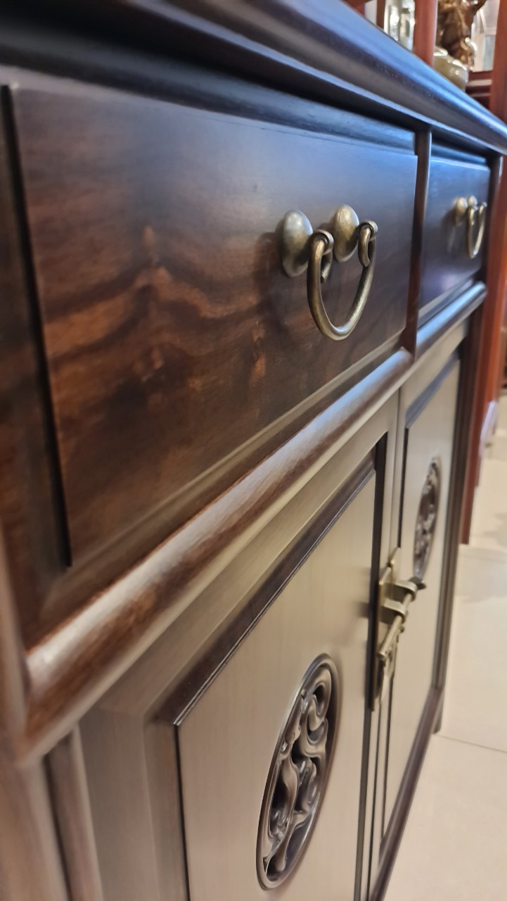 Tủ cánh chạm rồng có 2 ngăn kéo rộng, 1 hộc tủ lớn được chia làm 3 ngăn nhỏ. Phần cánh chạm họa tiết rồng lá sống động chính là điểm nhấn của tủ. Phần tay nắm được làm bằng đồng gắn kết chắc chắn. Các chi tiết kết nối với nhau bằng kỹ thuật ghép mộng truyền thống. Thiết kế đơn giản tiết kiệm thời gian khi lau dọn.